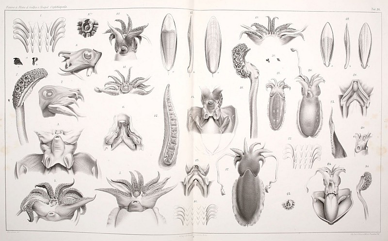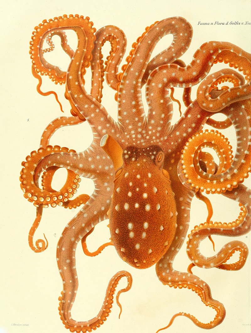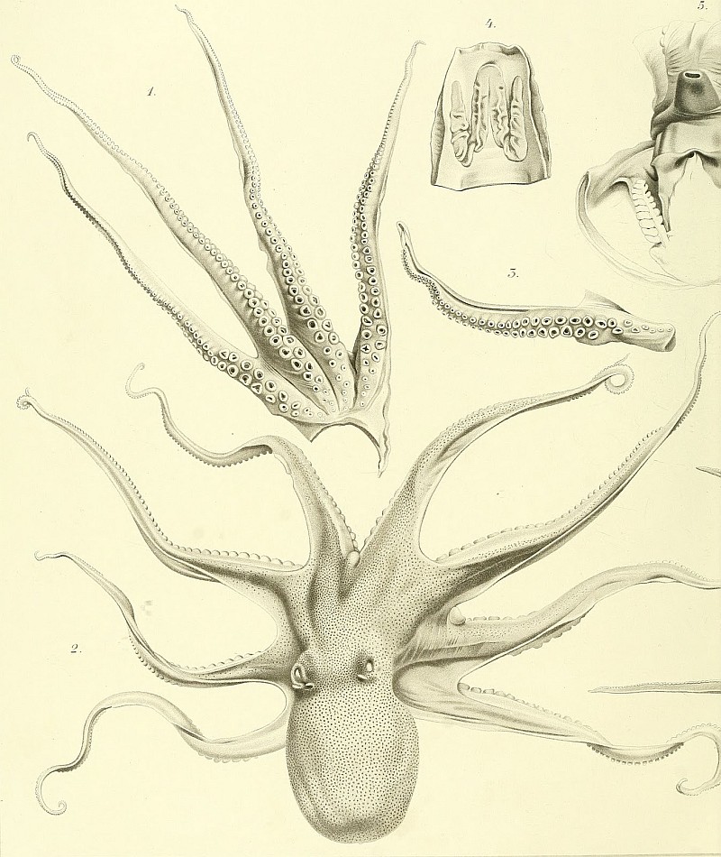 Las presentes imágenes corresponden al trabajo del ilustrador Comingio Merculiano (1845- 1915), un acuarelista profesional cuyos servicios fueron requeridos por el Zoo de Nápoles, e ilustran la monografía de Guiseppe Jatta de 1896 sobre los cefalópodos del Golfo de Nápoles. Son unos trabajos preciosos, y el conjunto puede disfrutarse tanto en forma de libro en la página de la Biodiversity Heritage Library, como en láminas independientes en ésta colección de flickr. Lo comparto, como mucho material que traeré en lo sucesivo por aquí, a través del indispensable blog BibliOdyssey. [I Cefalopodi viventi nel Golfo di Napoli (sistematica) di Giuseppe Jatta, Berlin :R. Friedländer & Sohn,1896.]