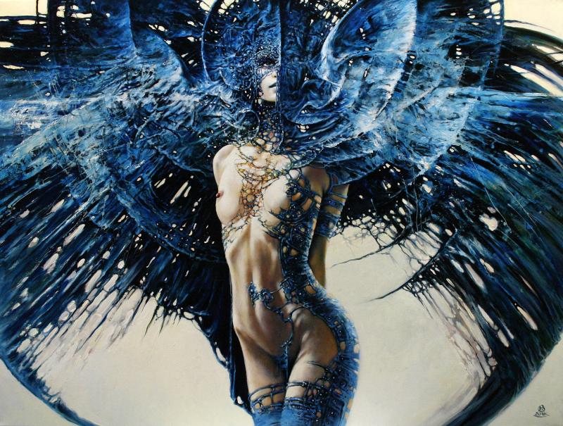 Karol Bąk is an admirer of women. He is a glorifier of womanhood. He paints captivatingly beautiful phenomenal shapes. He seems to desire to reveal their souls. Therefore, by various methods he examines the deepest parts of their nature. His seraphic heroines flow in the dream, appear in immense space; they are angels, pearl-divers, personification of elements and winds; incarnated murders (Judyta, Salome) and even death (Thanatos). Karol Bąk makes himself extremely great task for his intention is not to show women only from their physical side. However, he is aware of the fact that the woman is noticed not only as a body-subject from a point of view, but also as spiritual-physical human being, loving, delicate, and tender-hearted to utmost emotions. In other words, woman is variable and almost imperceptible. The artist wishes to show the woman’s nature throughout her body and more and more limited accessories.
