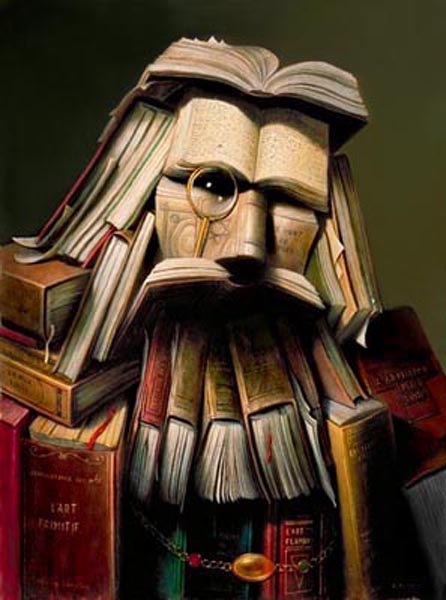 Durante sus primeros años experimentó con diferentes estilos, comenzando por los clásicos, el impresionismo , la abstracción, hasta alcanzar un punto de surrealismo con evidente influencia de Arcimboldo, componiendo entre otras cosas rostros con objetos o cuerpos. Lo conocí por sus personajes construídos a base de libros, pero hay mucho material suyo de gran calidad disperso en la red, por ejemplo aquí o aquí. Lo más parecido a su web personal (no sé si oficial, pero muy completa) es ésta.