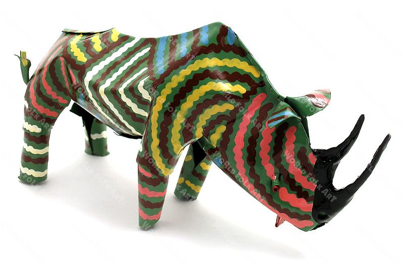 Simpático rinoceronte hecho de lata pintada, procedente de Zimbabwe. Latas viejas y otros desperdicios de metal en las áreas industriales de Harare, se convierten en deliciosas esculturas de la mano de cinco hermanos que descubrieron sus talentos artísticos. Provenientes de los estratos más pobres de Zimbabwe, fundaron su Proyecto de Escultores del Metal para representar la historia natural africana a través del trabajo de éste material, y así de paso obtener algo de dinero para subsistir.