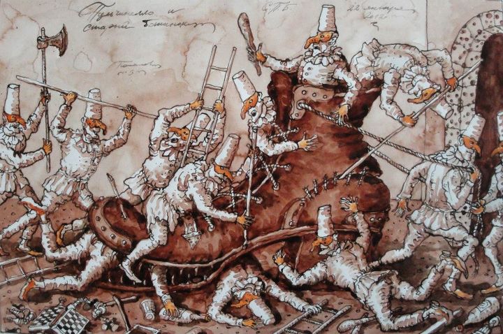 Los trabajos de este artista son impresionantes. En algún blog lo describen bastante acertadamente como "El Bosco" de este siglo. Ha creado un universo singular de personajes y animales fundidos con elementos arquitectónicos, así como magníficas obras corales muy del estilo de "El Jardín de las Delicias". Nacido en Poronaisk (Rusia) en el año 1955, ha vivido y trabajado en Kaliningrado, y actualmente reside en San Petersburgo. Trabaja tanto el óleo como el dibujo, acuarela y grabado. Su trabajo se colecciona ansiosamente en Estados Unidos y Europa.