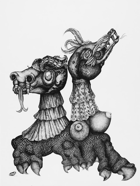 Most are ink drawings on paper, showing its obsessed preciousness in black and gray tones. Occasionally Darnet applies color with ink or watercolor.