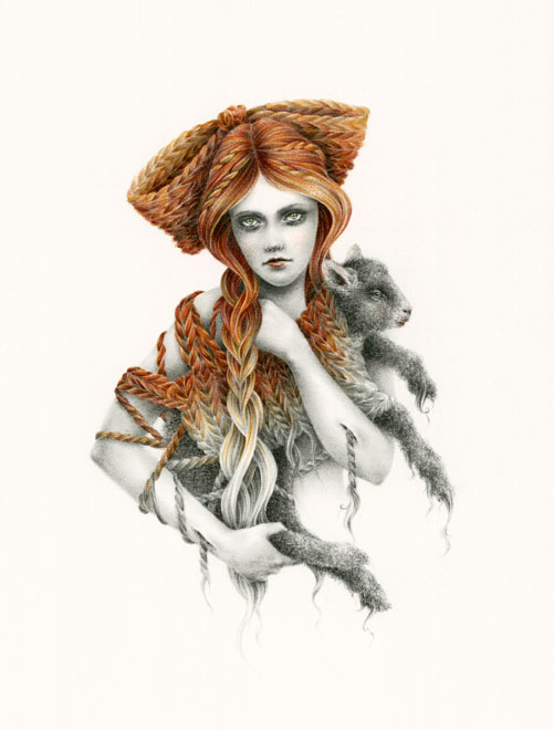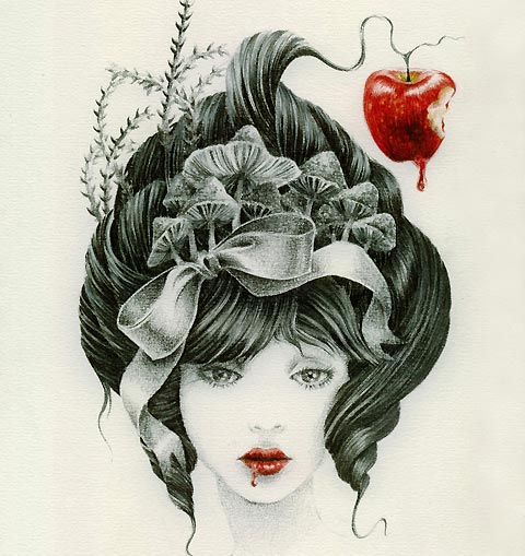 Marrying fanciful themes with graphite and colored pencils, self-taught Australian artist Courtney Brims creates odd yet sharply tender portraits set against white backgrounds. The lithe, milk skinned beauties are caught in moments of reverie as nearby slightly strange occurrences abound. The gray tones of the graphite are highlighted by flourishes of color, adding a play of light and depth to the detailed works. View more of the enchanting drawings below. More info in her website and her blog.