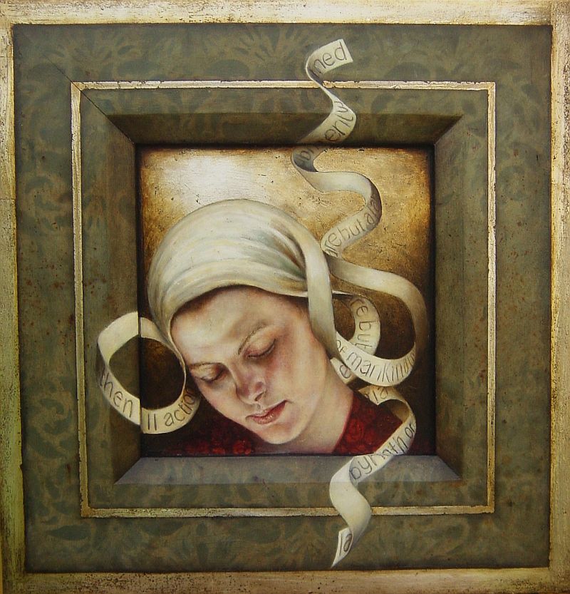 Storytelling, myths and religious iconography show us the possibilities of change, alchemical transmutations from the mundane life we lead. Through traditional imagery, text materials and painting methodology my work invite a questioning of the ideal. Paintings that hint at the seduction of beauty, jewels and brocades cocoons then binds us into a misplaced serenity. More info & paintings in her website.