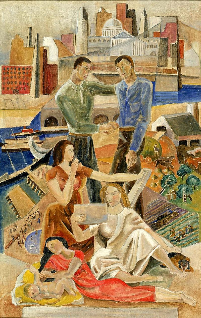 Her style developed and included more Cubist structure until she turned to creating embroidered tapestries after the birth of her two children. While she continued to paint and assist her husband, William Zorach, on larger projects, her main focus was on these tapestries. She completed two WPA murals for the Fresno post office.