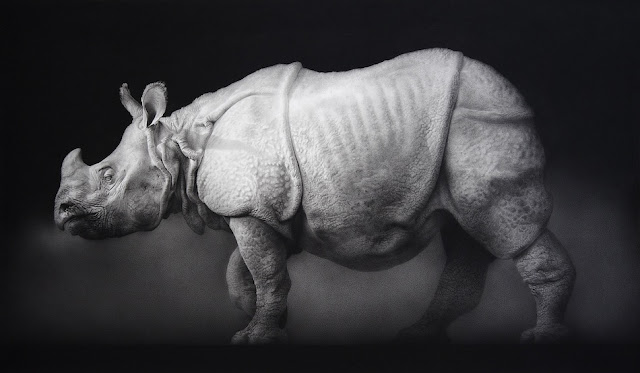 In my drawings I try to emphasize the singularity and silence of the form. By a careful balancing of tones I emphasise the way in which light and shade fall across the subject. By creating a settled half-light I try to transform the existence of the object from the ordinary to something more profound." Wonderful rhinos and also amazing the rest of his work.