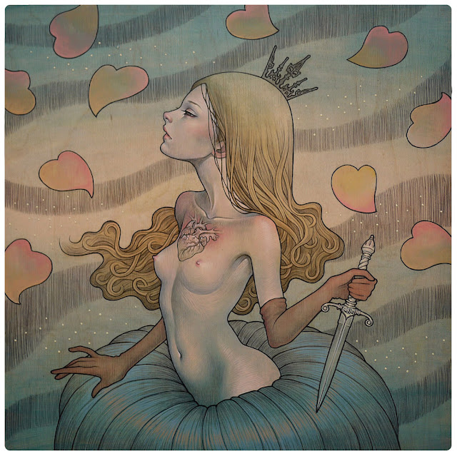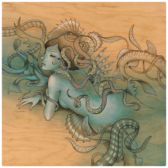 The themes in Audrey Kawasaki's work are contradictions within themselves. Her work is both innocent and erotic. Each subject is attractive yet disturbing. Audrey's precise technical style is at once influenced by both manga comics and Art Nouveau. Her sharp graphic imagery is combined with the natural grain of the wood panels she paints on, bringing an unexpected warmth to enigmatic subject matter.