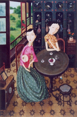 Las mujeres de Mei coquetean tomando el sol bajo el resplandor luminiscente producido por los fragmentos de luz natural del sol que se filtran en los patios abiertos.