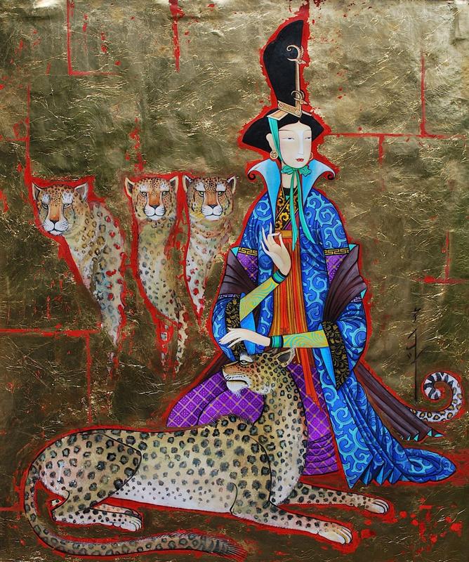 Many of Zaya’s paintings depict noble or royal Mongolian women, all with costumes and hair styles drawn from traditional fashion designs of nomadic aristocracy. These figures are often accompanied by wild animals such as snow leopards and cheetah or wolves symbolizing the connection of beauty to nature.