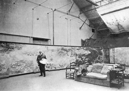 Claude Monet realizó, hacia el final de su vida, un mural de tres piezas o tríptico titulado Water Lilies (Lirios de Agua o Nenúfares) en técnica de óleo sobre tela. Cada uno de los tres segmentos mide 2 metros de alto por 4.2 de ancho. La obra en su totalidad tiene una longitud de 12 metros por lo que para apreciar la obra a detalle hay que caminar a su lado algunos pasos y así recorrer la marcada horizontalidad de su formato.