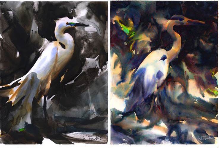 Izq./ Left: "Martinete", acuarela sobre / "Night heron", watercolor on hot press illustration board.