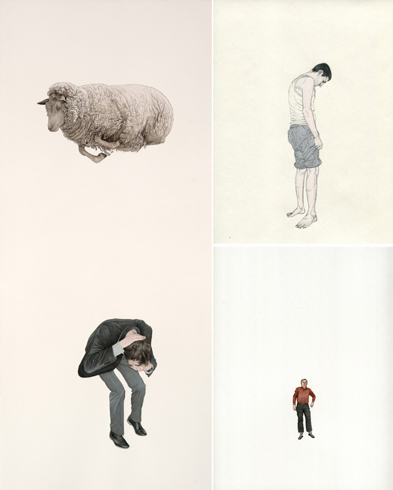 R: Mi trabajo es una especie de copia-pega. Tomo cosas de todos lados. Utilizo mi iPhone para fotografiar cosas o gente en las calles: una mujer, un sin techo, una muchedumbre, una oveja en una plataforma... Entonces intento apropiarme de esas cosas, de esa realidad, para mí mismo. Nunca he quedado satisfecho con un dibujo en mi vida, pero llega un punto en el que debo detenerme. De otro modo, volvería a comenzar. El volumen de un muslo, el pliegue de la pierna de un pantalón ... Trabajar en varios dibujos a la vez me ayuda a dar un paso atrás y dejar un dibujo. Suelo ir demasiado lejos en el detalle y arruinar un dibujo. Es mejor decir muy poco que demasiado.