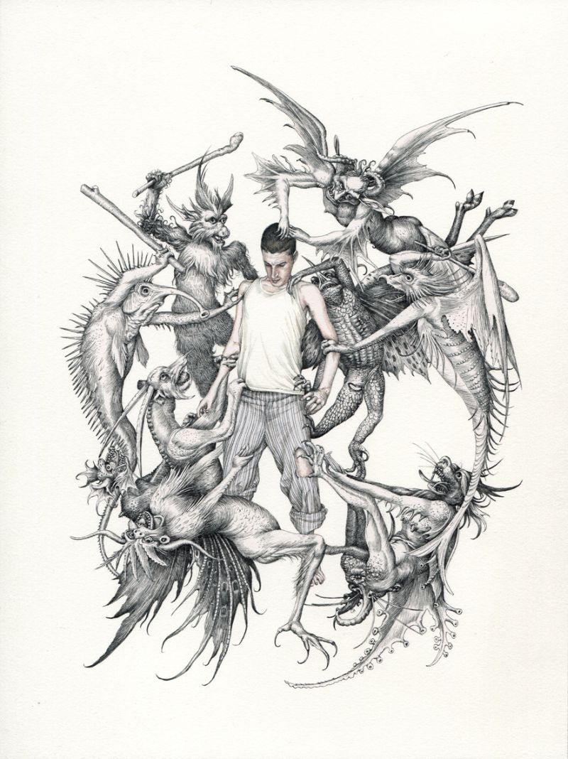 These renderings, simultaneously absurd, humorous, ironic and cruel, weave their own tapestry of tales and legends, blurring the line between what has been written and what our memory has forged. Mérelle’s insistence on anatomical precision, an art historical tradition borrowed from great draughtsmen such as Albrecht Dürer, adds a dimension of doubt and moderate belief, as the viewer simultaneously quizzes yet recognises and understands what he sees. Mérelle thus brings our inner thoughts and mental scenarios on to the surface of a page, channelling psychological theories of great 20th century thinkers such as Pierre Janet, and providing viewers with a visual of what the depths of our minds might conjure.