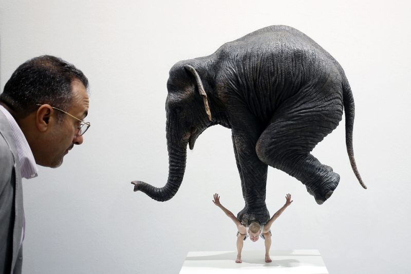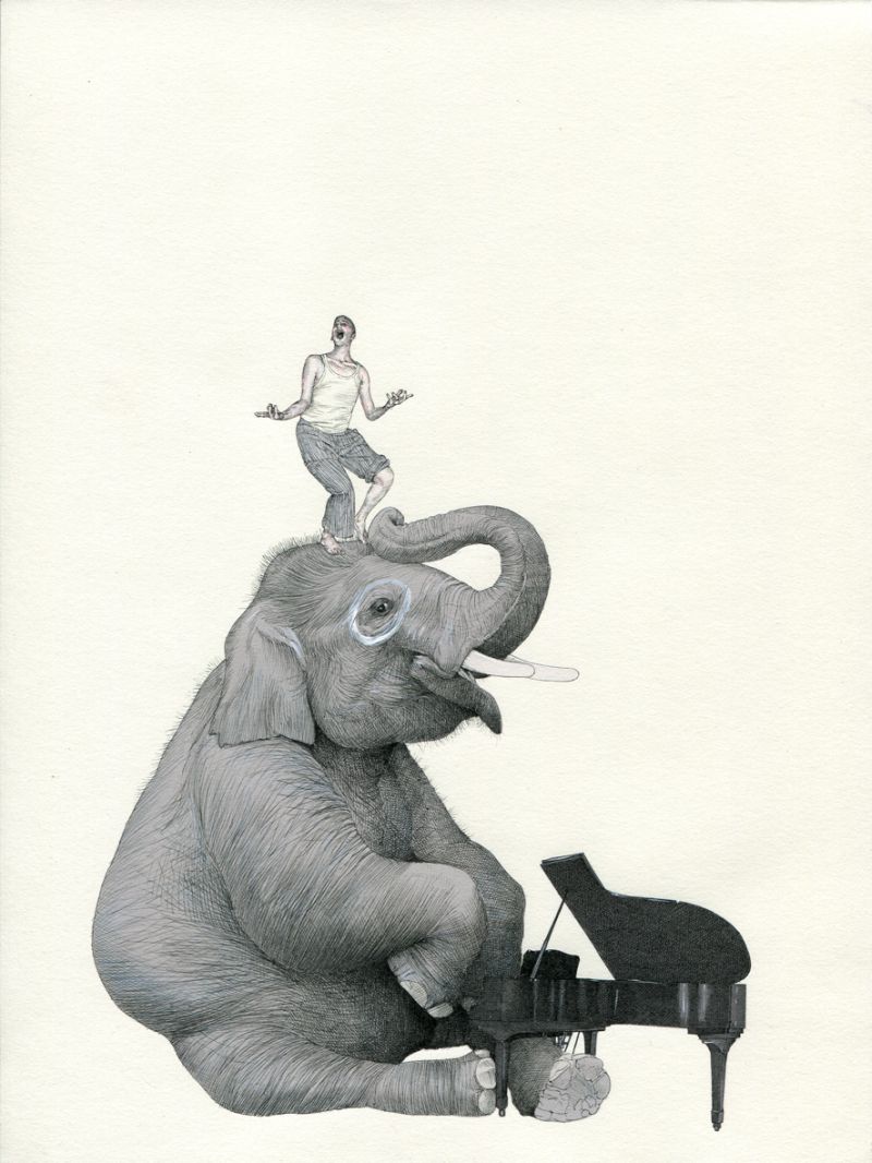 A: I draw compulsively. The desire usually starts with a detail. For a drawing with a big elephant, everything began with the ear. I just really wanted to draw an elephant's ear! I can't draw well if the desire isn't there. The detail then provides a structure for the rest. I want the realism to allow me to do things that are completely unrealistic, like talking to my grandfather, for example, who is no longer with us, or flying on the back of a giant squirrel…