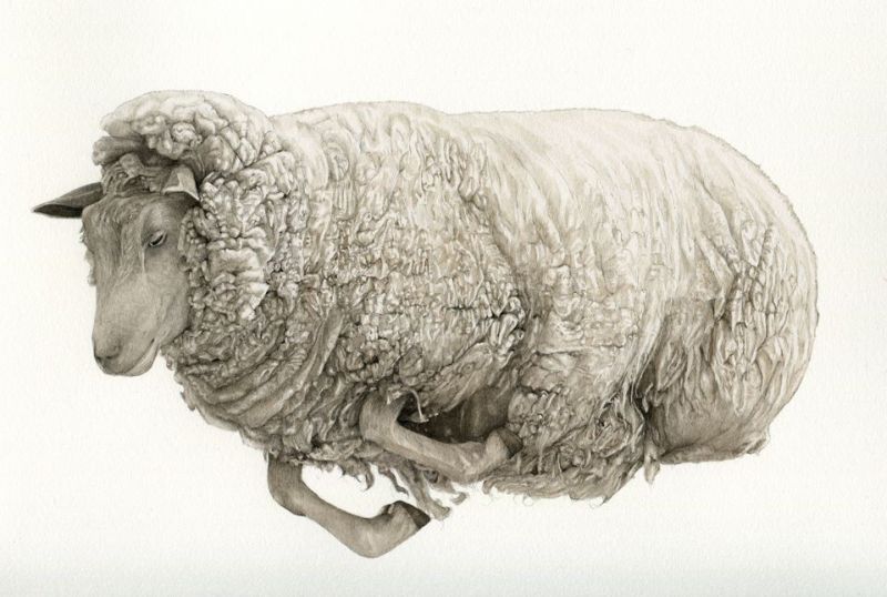 Izq./ Left: "Mouton / Oveja / Sheep", tinta y acuarela sobre papel / ink and watercolor on paper, 88 x 44,5 cm., 2012© Fabien Mérelle