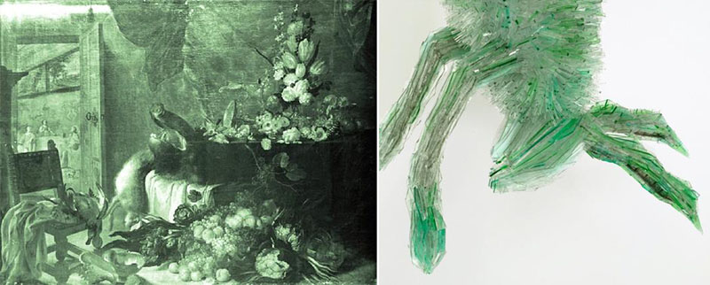 For the subjects of her works, the artist finds inspiration in the paintings of the great masters, in which pets – mostly dogs – are side by side with the subjects, acting almost like prestigious objects that are exhibited as synonyms for wealth and power. To construct these works, she starts with a metal skeleton that is then carefully covered with sharp shards of glass...