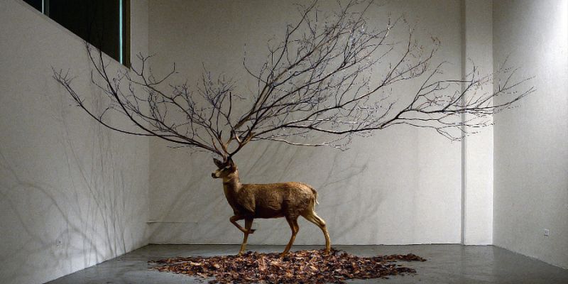 "Sin título, Ciervo / Untitled, Deer", taxidermia, ramas, hojas / taxidermy, branches, leaves, 2008 © MyeongBeom Kim