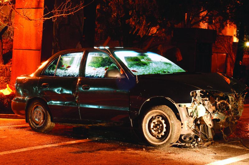 "Sin título / Untitled", coche chocado, peces, agua, técnica mixta, instalación /