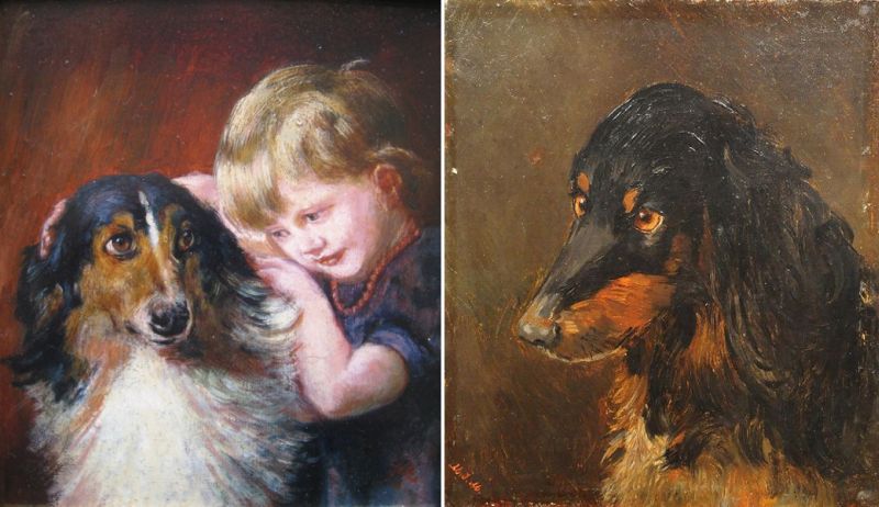 Izq./ Left: "Los mejores amigos / Best Friends", óleo sobre panel / oil on panel, 17,78 x 22,86 cm., 1897