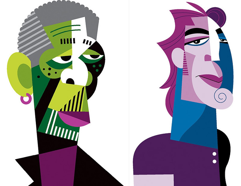 Pablo's drawings are built based on geometry and flat colors, and are easily recognizable. A very personal and unmistakable style, and clear predilection for musicians. I've always loved cartoonists' ability to synthesize the salient features of a person, in the case of Pablo, same as in Turcios, for example, that uniqueness is even more relevant since the model construction is not simply exaggerate the traits in order to make bigger the big or smaller the tiny, but a new structure of the subject that still admirably retains the essence of the character caricatured.
