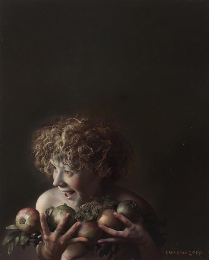"石榴 / Chica con granadas / Girl with Pomegranates", óleo sobre tabla, 85 x 60 cm., 2010 © Lui Liu