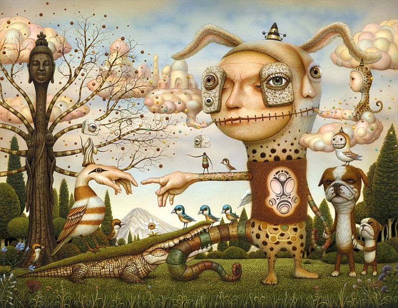 At first glance Naoto Hattori's works may seem made digitally, but are pure brushwork, usually using acrylics. Compositions with surreal elements and strange beings, often playing with irony, parodying characters or artworks by the Classics. Notable are also his landscapes, almost all green rice fields and meadows with trees and mountain background.