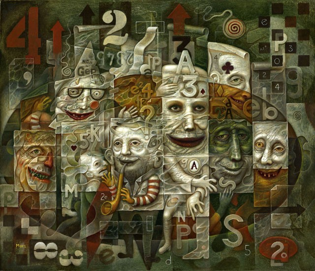 Der./ Right: "Equilibrio / Equilibrium", óleo sobre panel / oil on panel, 13" x 11", 2011 © Chris Mars