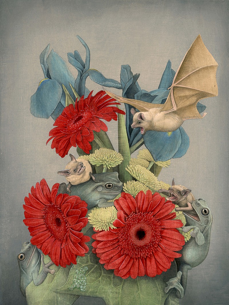 Tiffany Bozic has spent the majority of her life living with and observing the intricacies of nature. Her work has the traditional air of tightly rendered nature illustrations but with a highly emotional range of surreal metaphorical themes. In her paintings and sketches she presents her vision of life’s struggles and triumphs that are largely autobiographical. Her wide array of subjects are inspired both from her extensive travels to wild places, and the research specimens at the California Academy of Sciences in San Francisco, CA.