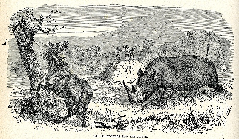 Podemos ver un artículo titulado "Deporte en los afluentes superiores del Limpopo y en la tierra de Makalaka", encabezado por dos cabezas de rinocerontes: el "Mochocho, o rinoceronte blanco común", y el "Keiloa, o rinoceronte negro bicorne".