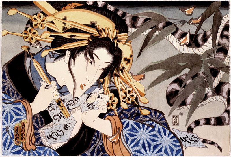 «Kunisada's work has a personality and that's what really fascinated me. If I'm going to express social issues and culture issues using figurative painting, I thought I may like to follow his tradition. And also I felt that... a number of compositions he did, really superb compositions, so powerful that I didn't find other artist could do. I like lot of ghost image prints. They are really magnificent. Just so beautifully done but still he could convey awsome sort of a scary feeling, that is something that not many artists can do.» Masami Teraoka