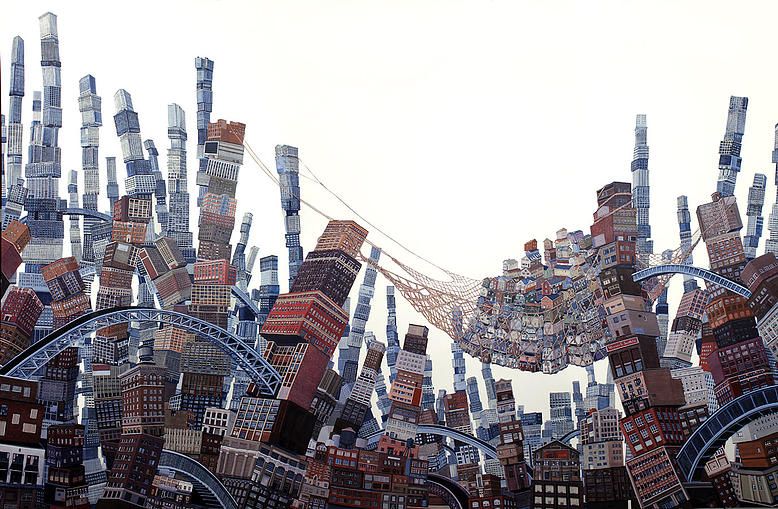 He estado viendo ciudades de todo tipo (algunas son quizás sólo pueblos o aldeas, o una fiesta del barrio) evolucionar en mis pinturas desde hace algún tiempo. Mis ciudades están conformadas por: observaciones cotidianas, causa y efecto, una narrativa no lineal, composición, movimiento y color, privación del sueño y, a veces, el deseo de ver grandes grupos trabajando juntos hacia una meta común; hacer algo más grande que ellos mismos individualmente. Aunque mis ciudadanos han pasado por momentos difíciles y peligrosos, ahora estoy tratando de centrarme en el crecimiento (que, me doy cuenta, es también con frecuencia difícil). Estoy tratando de echar algunas raíces en un paisaje sin tierra y seguir adelante. La naturaleza ha encontrado su camino de vuelta al trabajo, y todavía estoy descubriendo el papel que juega y adonde está yendo todo esto. Tengo curiosidad acerca de la capacidad de recuperación de la vida y de nuestra capacidad para seguir adelante enfrentando circunstancias siempre cambiantes. Mis pinturas celebran esta capacidad y también mi amor por el paisaje urbano.»