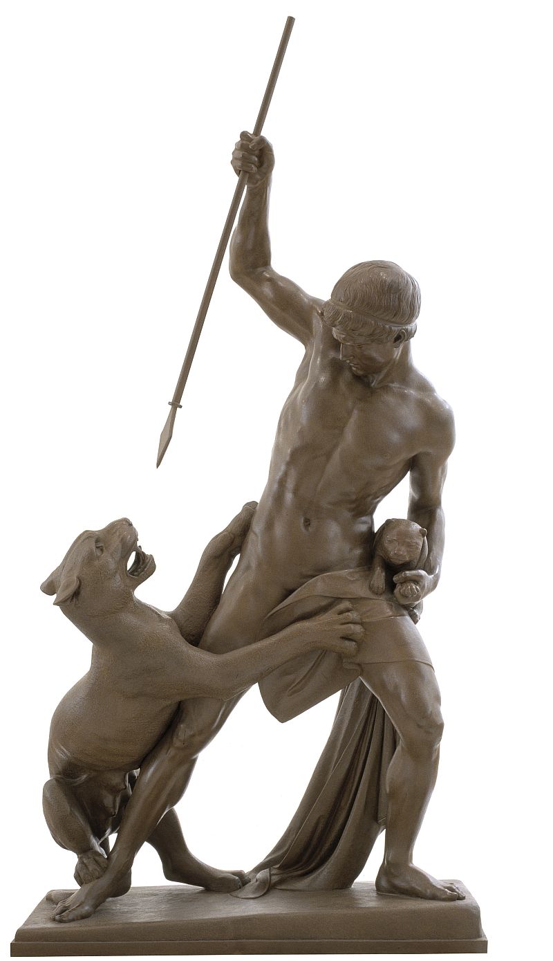 El cazador está alzando su lanza para asestar el golpe definitivo. La fuerza y violenta descarga de energía está representada a través de una composición dinámica y una representación muy naturalista del hombre y el animal. Naturalmente, el dramático momento está congelado en el tiempo, y los espectadores están llamados a completar la acción por sí mismos.