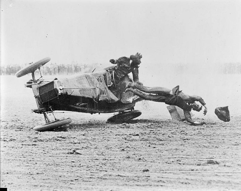 "Southport, Inglaterra. Una foto singular, tomada en el preciso momento en que vuelca un coche de carreras conducido por Miss Mary Cunliffe, conductora inglesa, durante la carrera de las 100 millas de Southport Sands. Se ve a su padre, que copilotaba el coche, siendo arrojado fuera de éste. Él murió y ella resultó gravemente herida./