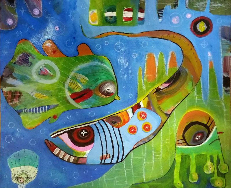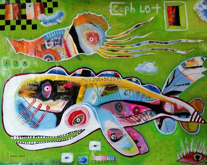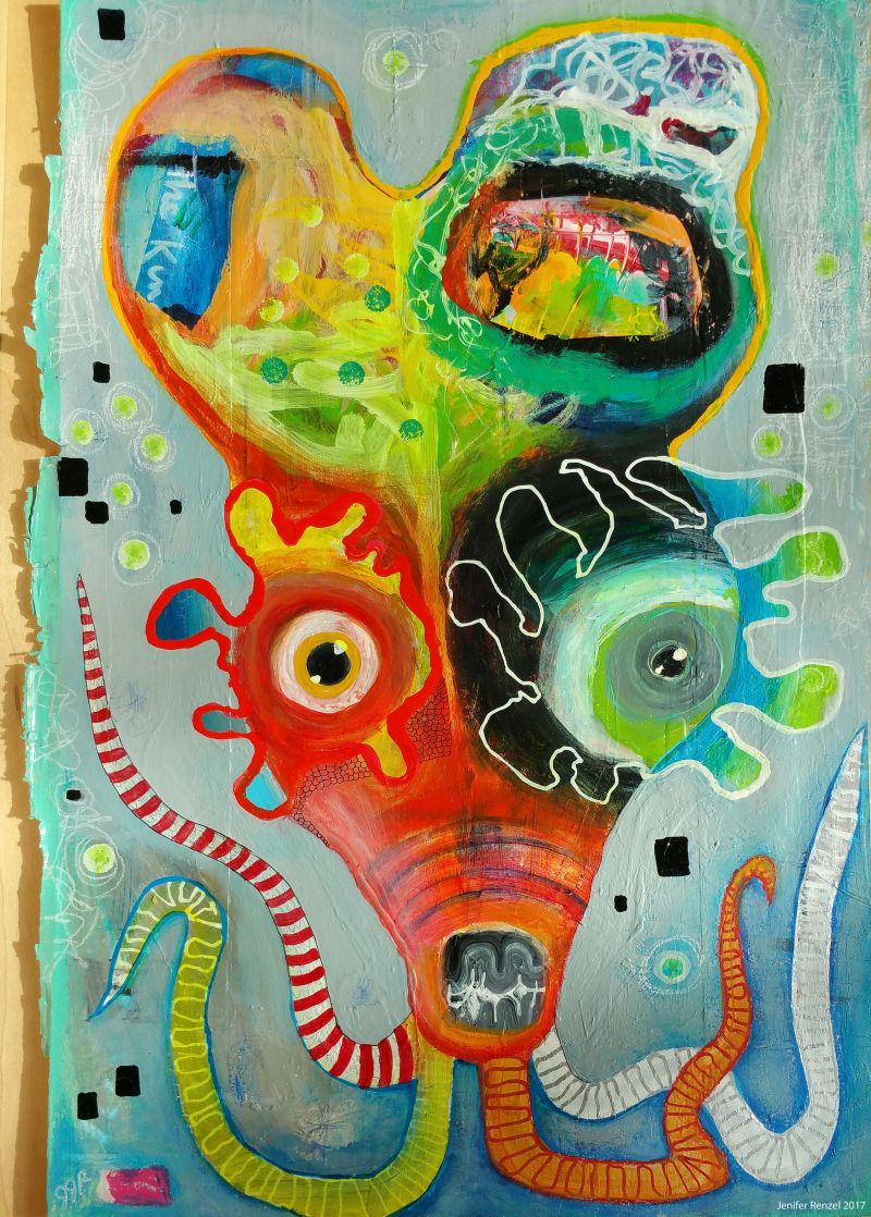 Jenifer Renzel es una interesantísima artista estadounidense cuya práctica gira en torno a la pintura y el ensamblaje. Les presento una selección de su obra en un par de posts, el primero de los cuales (el segundo aquí) dedico a sus coloridas e imprevisibles pinturas, que a pesar de su caos aparente y origen espontáneo, de una u otra forma casi siempre incluyen o permiten intuir la presencia de seres singulares, animales fabulosos y bestias imposibles, algo siempre bienvenido en este blog con tendencias marcadamente animalistas.