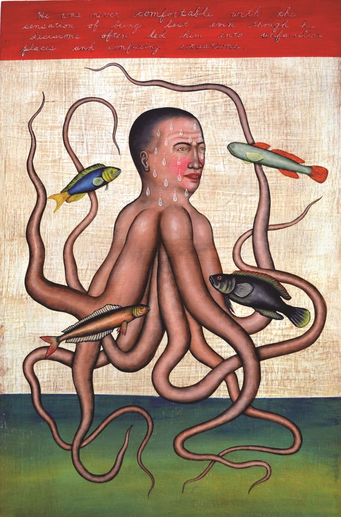 «I have some really good coffee-table books with glossies of my favorite artists. I have Basquiat, collections of Dada artist, books with vintage Japanese monster movie posters, instructional art books, and several collections of outsider art. I also have some great Pinterest boards and image collections that often inspire me. Sometimes, I just let my imagination wander before I fall asleep. It’s surprising to me how my mind will just flip through ideas and come up with images – it feels almost driven from outside of me.»