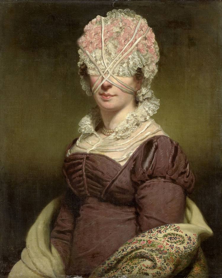 I cover the faces in different ways, but I do not add anything from the outside to the paintings. I only reshape individual elements of the painting itself, taking into account the special characteristics of the painter and the painting. The Hidden Portraits are a contemporary view of art history, of paintings as part of representation. I hide individuality behind the magnificent surfaces and try to incorporate a contemporary discourse on codes of clothing and society into historical paintings.»