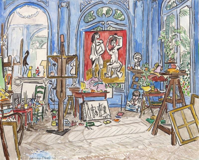 «Este fue el primer cuadro que hice del Estudio de Picasso en Cannes. Mientras hacía esta pintura, descubrí que Picasso usaba casi todas las habitaciones de la planta baja de su villa art decó como estudios. Entonces decidí unir ocho pinturas para poder caminar por la planta baja y ver los cientos de obras que estaba haciendo en 1956.»