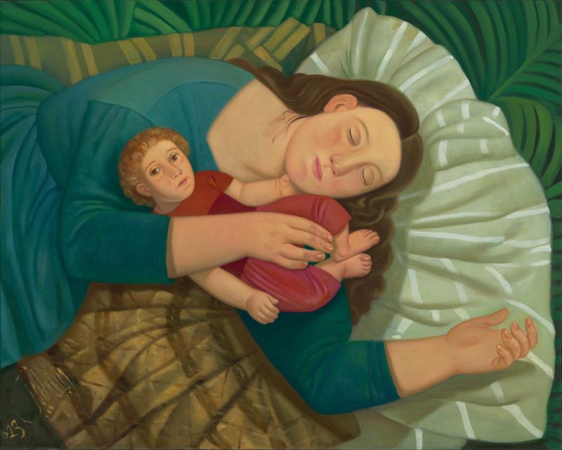 «Though much of Aleiby’s work deals with historical suffering, conflict and loss, the mood of each painting is set by distinct and varying colour palettes that pro-vide a metaphorical lens to guide our interpretations. In one painting of a woman sitting with a young boy between her knees, the warm tones of the room and fabrics indicate an intimate, domestic setting: a sense of home. Yet, the woman’s expression is cool and stern, whilst the boy appears distracted and uncomfortable, his gaze turned upwards and his legs restless. As with all of Aleiby’s work, we are directed away from the exterior image towards the layers of embedded subjectivity: the humanity. It is this sensitivity and depth that elevates the work beyond the purely visual so as to leave a powerful and resonating impression on the viewer.» Millie Walton (4)